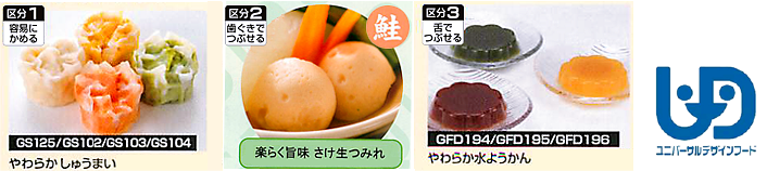 日本介護食品協議会が制定する規格に適合しており、「かたさ」「粘度」に応じて4つの区分(区分1:容易にかめる/区分2:歯ぐきでつぶせる/区分3:舌でつぶせる/区分4:かまなくてよい)に分類されています。